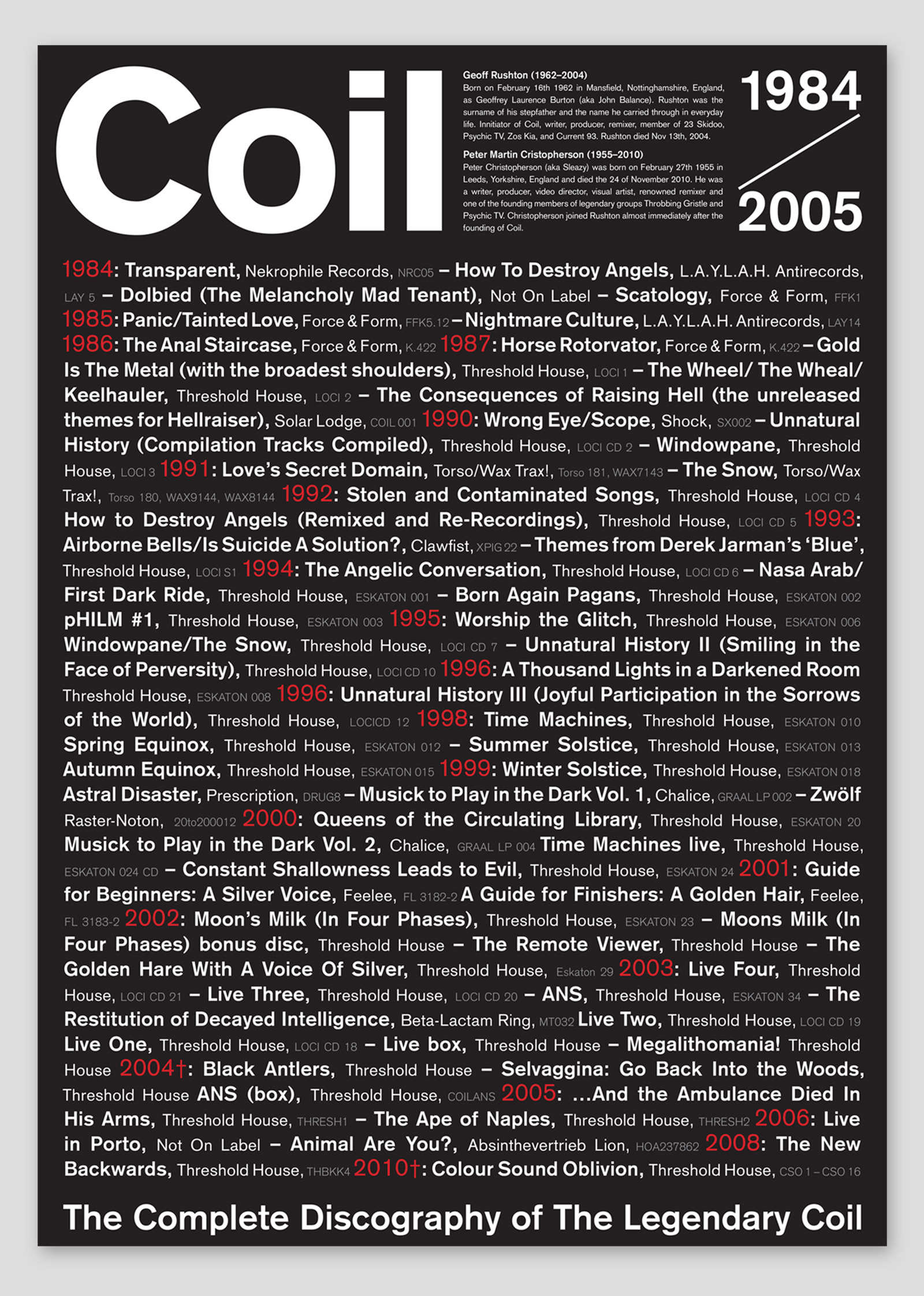 A double-sided tribute poster to the one and only Coil. The A-side of the poster contains the complete discography of Coil and shows their tremendous creativity and dedication to music. The B-side shows the importance of Coil to me as an artist/designer and the way their music inspires me.